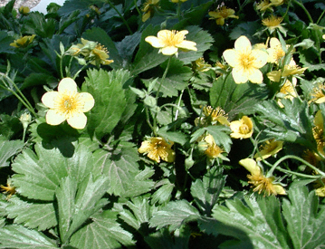 showy yellow flowers and strawberry-like