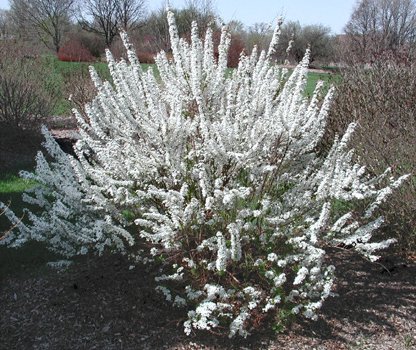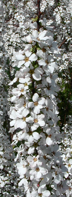 | Attributes: | spring white to pink flowers cover bush. |